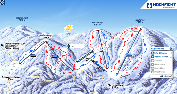 Skiareál Hochficht disponuje moderními 4sedačkovými lanovkami a vleky a proto si zde můžete užít lyžování bez čekání ve frontách. Sjezdovky o celkové délce 21 km v nadmořské výšce 858-1338 m a výkonná sněžná děla zaručují všem lyžařům kvalitní lyžování po celou zimu.